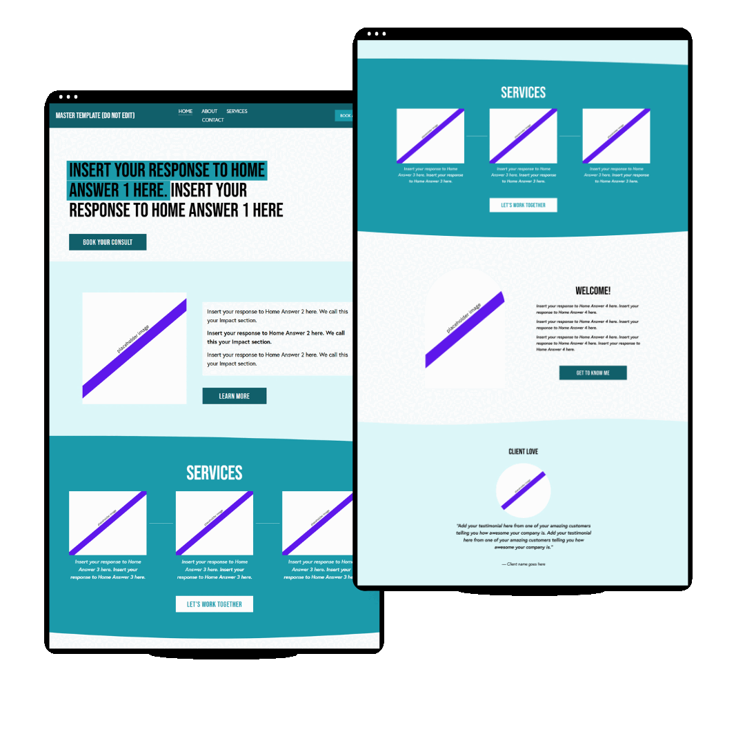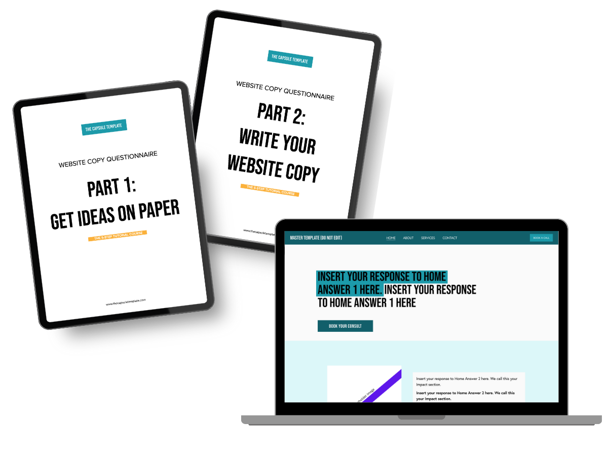 Website copy documents and fill-in-the blank style prompts to help you write your web copy PLUS we show you where on the page you should put the copy in the tutorial course